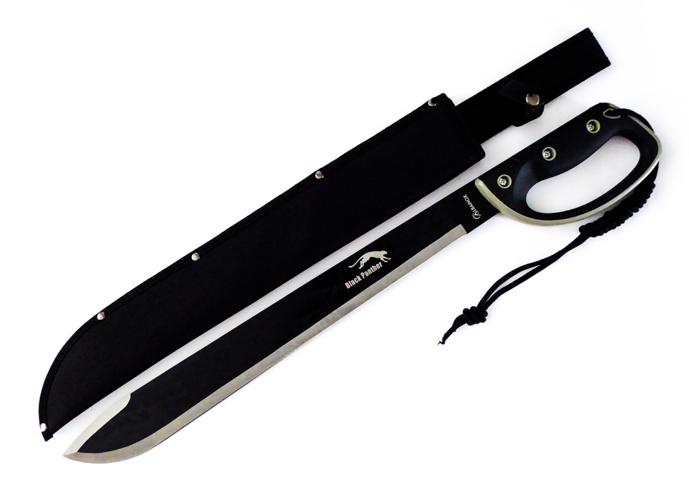 Descripción: Machete Cortacañas BLACK PANTHER con mango en ABS y goma, negro y gris, con cordón. Hoja de acero inoxidable molibdeno vanadio acabado negro y acero, con sierra en el lomo. Incluye funda en nailon negra.
