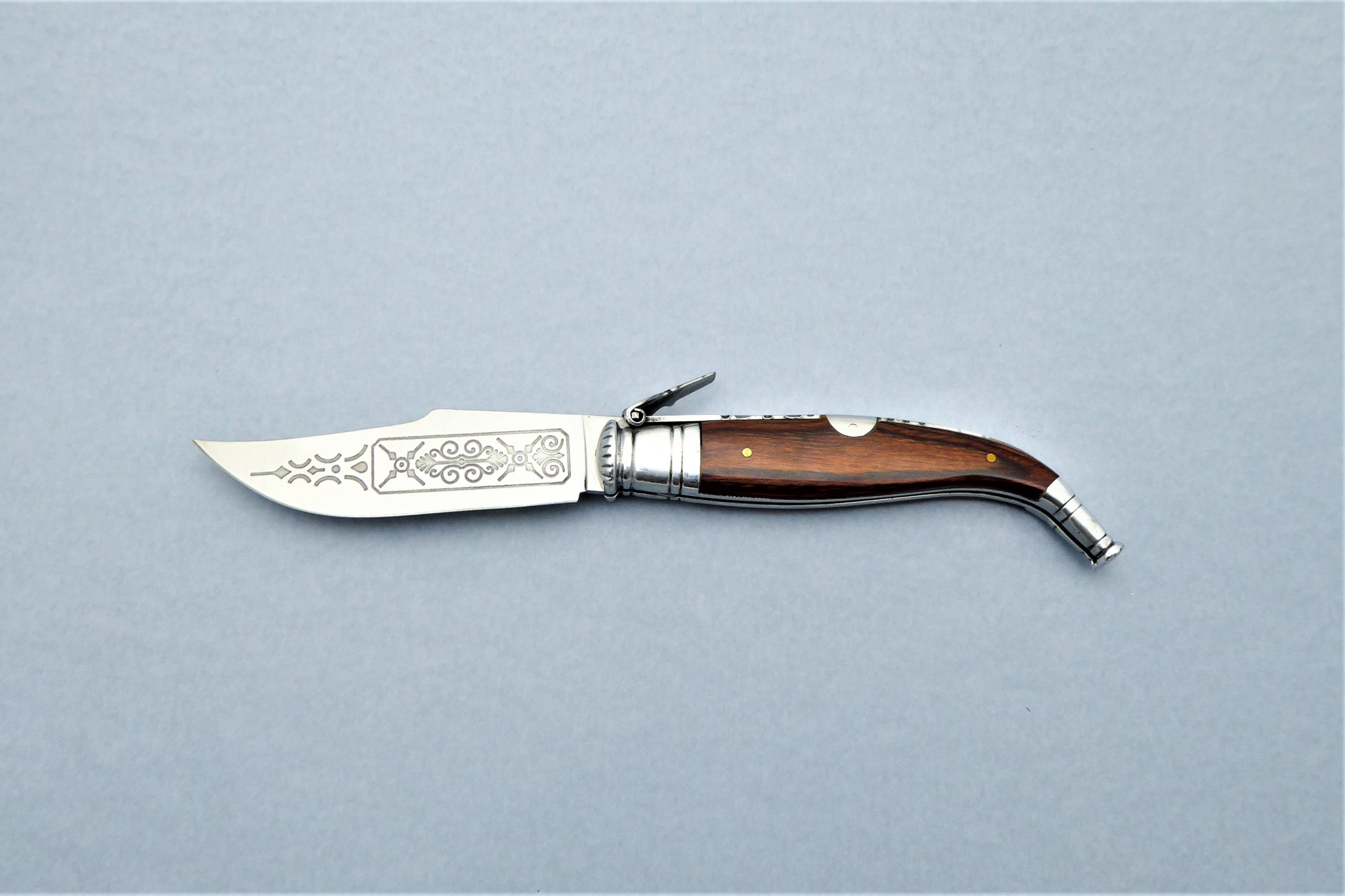 Descripción: Navaja clásica «Lujo» decorada, con mango de asta de toro, virola y rebajo en aluminio. Hoja de acero inoxidable molibdeno vanadio decorada. El muelle es de acero con palanquilla. Incluye peana.